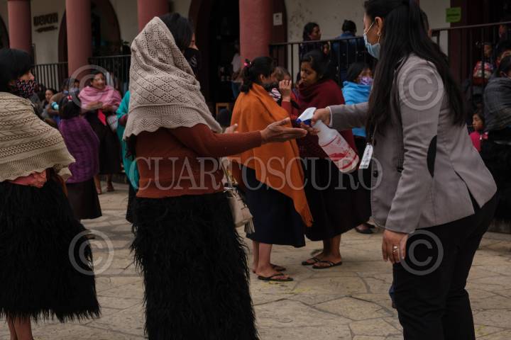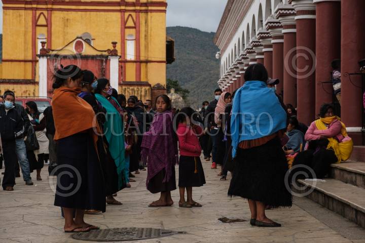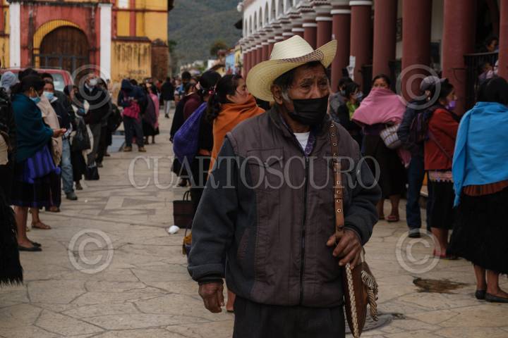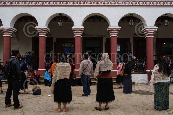 Decenas de personas originarias de Los Altos de Chiapas permanecen formadas para recibir remesas provenientes de Estados Unidos.