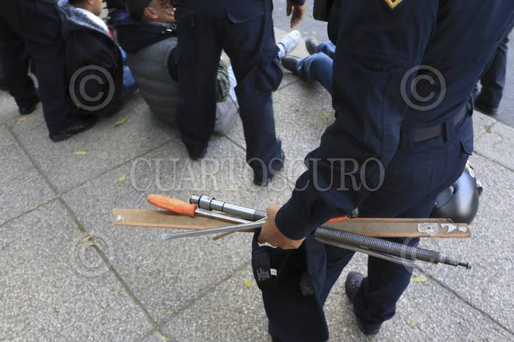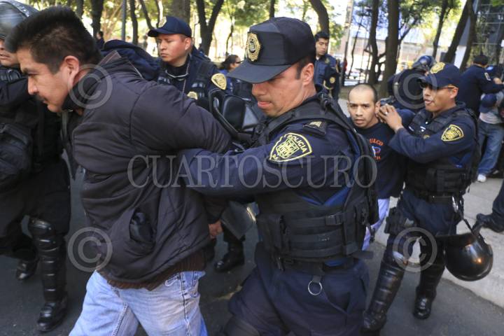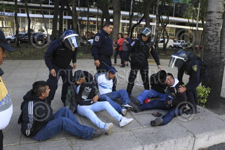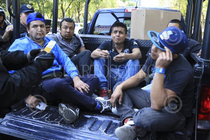 CIUDAD DE MÉXICO, 20ENERO2017.- Elementos de la Secretaria de Seguridad Pública de la Ciudad de México detuvieron a un grupo de hombres que portaban palos tubos y objetos punzocortantes. Los policías detuvieron su paso de dichas personas después de que rompieran un cristal del Turibús. Los detenidos fueron remitidos al Ministerio Público de la delegación Cuahutemoc para verificar su estado jurídico. FOTO: SAÚL LÓPEZ /CUARTOSCURO.COM