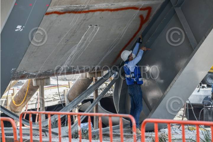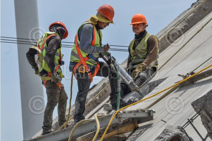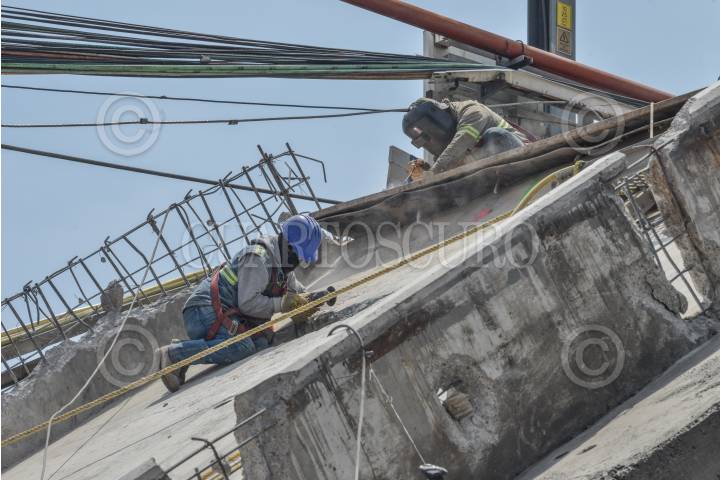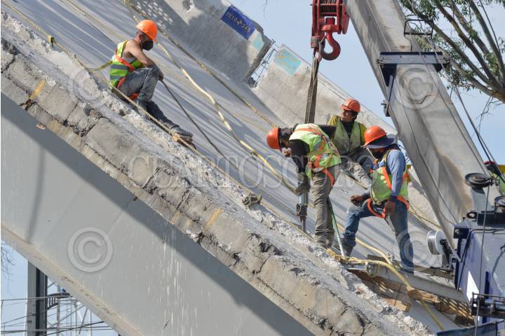 Continúa la remoción de escombros del tramo elevado del metro Olivos Línea 12 que se desplomó el 3 de mayo. En la zona trabajadores de obras utilizan martillos demoledores y sopletes en una de las estructuras afectadas.