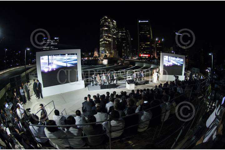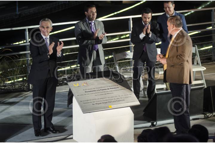 MÉXICO, D.F., 08ABRIL2013.- Miguel Ángel Mancera, Jefe de Gobierno del Distrito Federal, encabezó la inauguración de la zona remodelada en la Glorieta de la Fuente de Petróleos, ubicada en el cruce de Anillo Periférico y Paseo de la Reforma. Las innovaciones con que cuenta esa obra destacan un muro cascada y un talud vegetal, conformado por cinco terrazas que contienen especies vegetales de fácil adaptación. FOTO: MISAEL VALTIERRA / CUARTOSCURO.COM