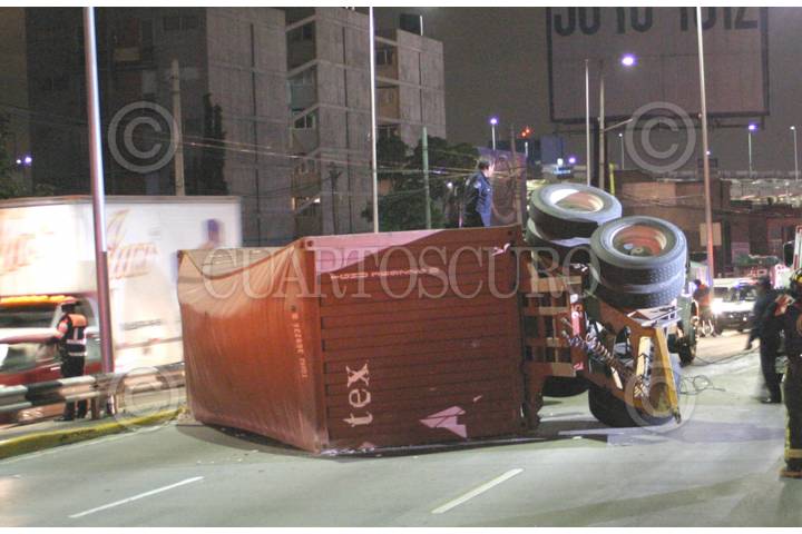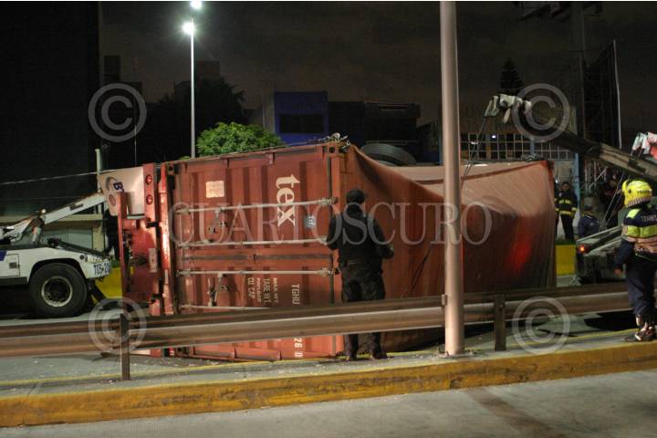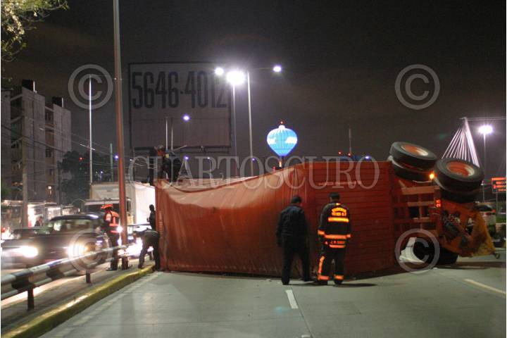 MÉXICO, D.F., 02SEPTIEMBRE2009.- Esta madrugada volcó la segunda caja de un trailer doble remolque, en los carriles centrales del Circuito Interior a la altura de la colonia Peñon de los Baños, provocando un severo caos vehícular por mas de cuatro horas. FOTO: LUZ ACEVEDO/CUARTOSCURO.COM