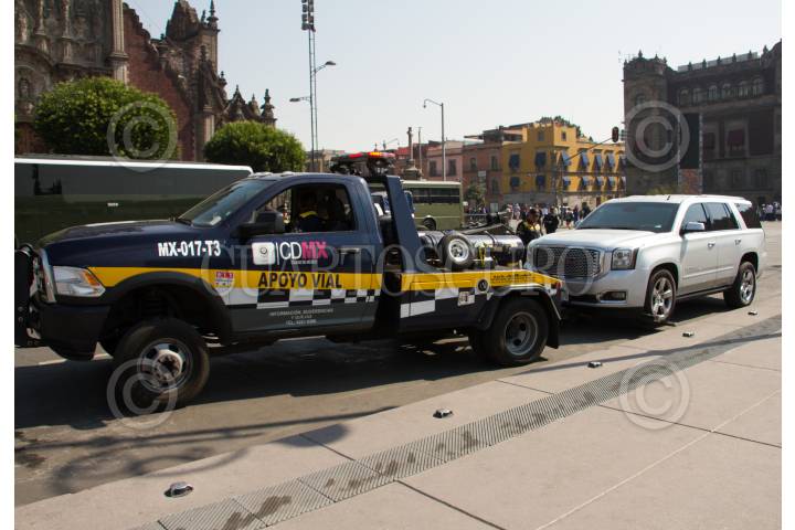 CIUDAD DE MÉXICO, 11MARZO2019.- Policías viales remolcaron una camioneta con placas del estado de Durango que se encontraba mal estacionada frente a la plancha del Zócalo. Esto ocurrió mientras el presidente Andrés Manuel López Obrador rendía el informe a cien días de estar al frente del poder ejecutivo. FOTO: ROGELIO MORALES /CUARTOSCURO.COM