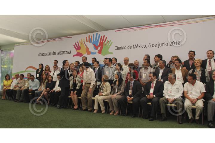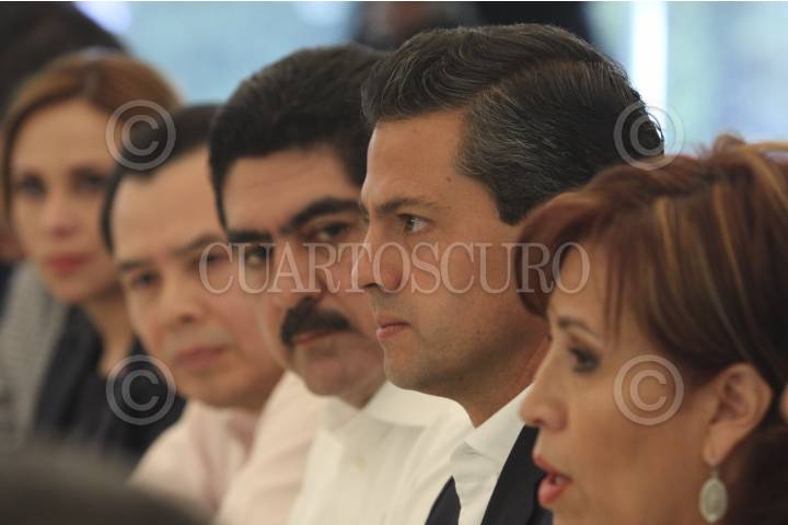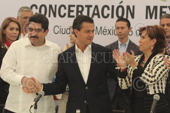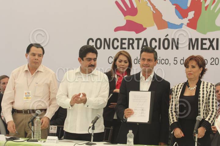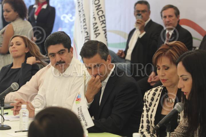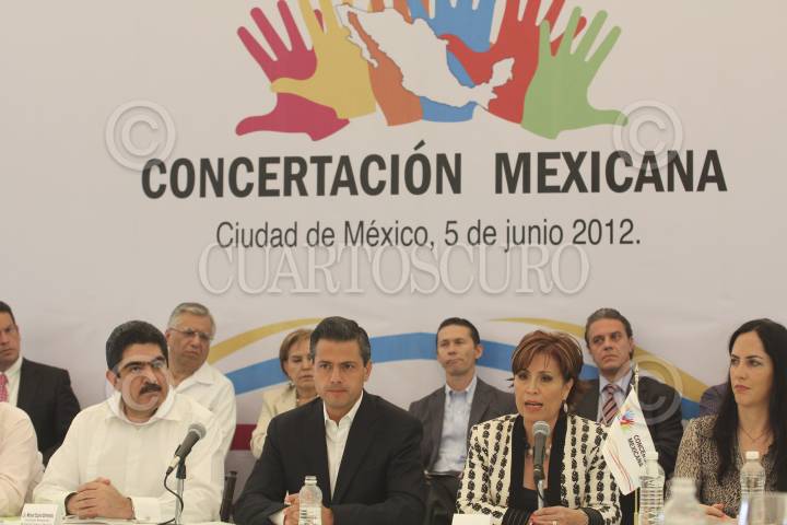 MÉXICO D.F., 05JUNIO2012.- Enrique Peña Nieto, candidato a la presidencia de la coalición “Compromiso por México” acompañado de Rene Arce, Manuel Espino, Rosario Robles y Lia Limón, durante la firma del plan de Concertación Mexicana con exdirigentes nacionales y militantes de los partidos de la Revolución Democrática y Acción Nacional. FOTO: SAÚL LÓPEZ /CUARTOCURO.COM