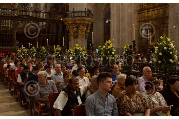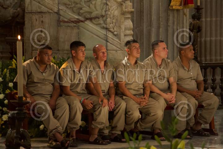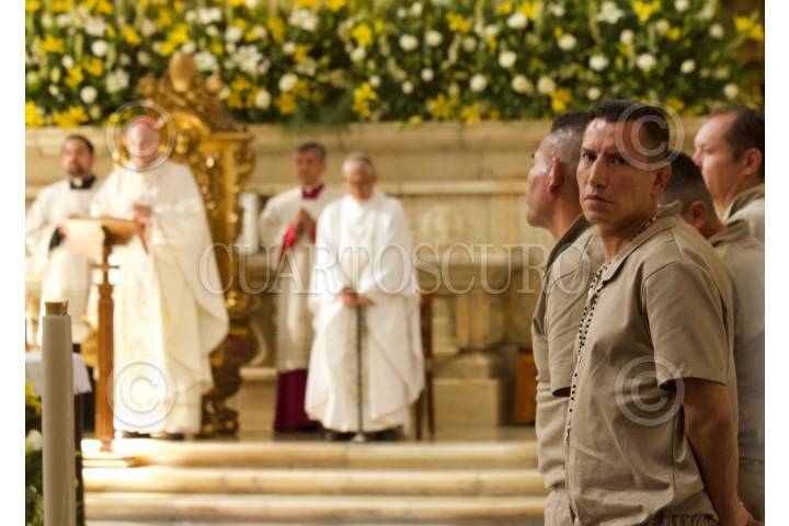 CIUDAD DE MÉXICO, 18ABRIL2019.- El lavatorio de pies fue encabezado por Carlos Aguiar Retes, Arzobispo Primero de México en la Catedral Metropolitana. Donde la tradición de los 12 apóstoles fue representados por reos del Centro de Ejecución de Sanciones Penales Varonil Norte, esto como parte de los festejos de la Semana Mayor en la Ciudad. FOTO: ROGELIO MORALES
