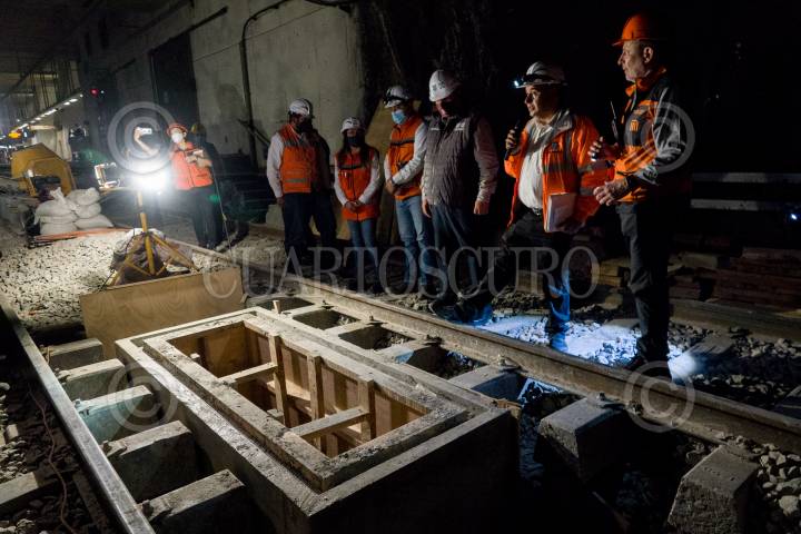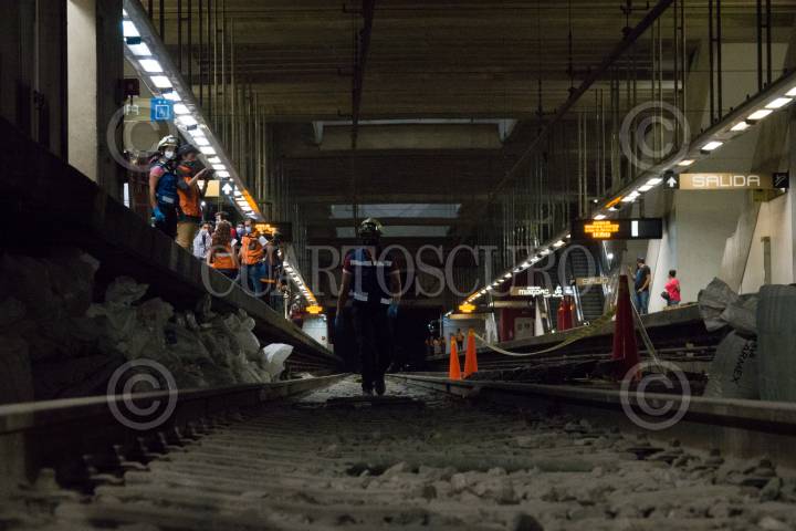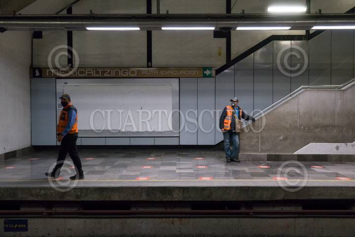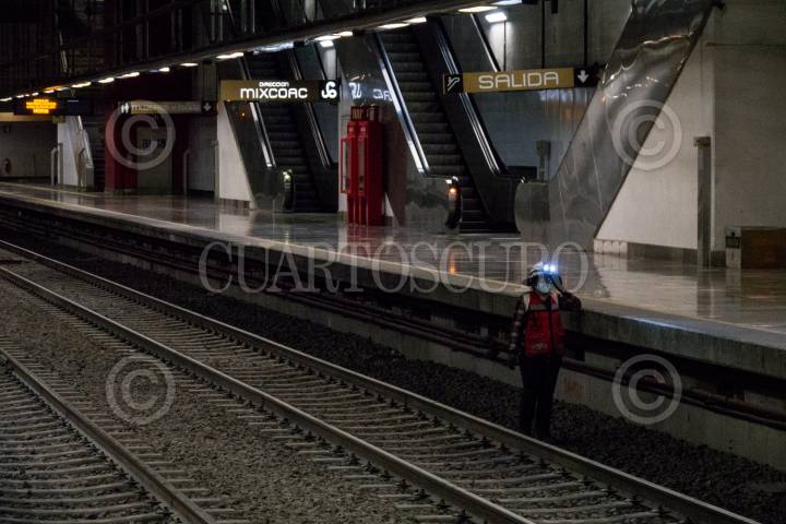 Un trabajador se ve en la estación Mexicaltzing durante los trabajos de reparación de la parte subterránea de la Línea 12