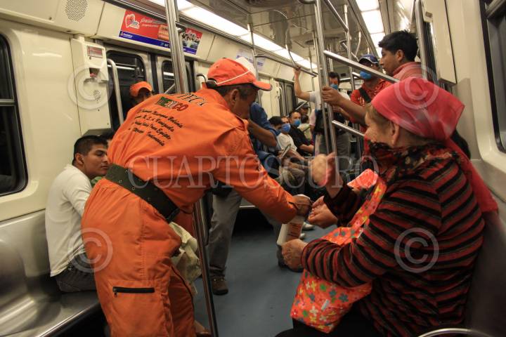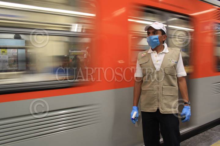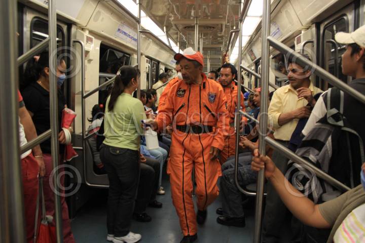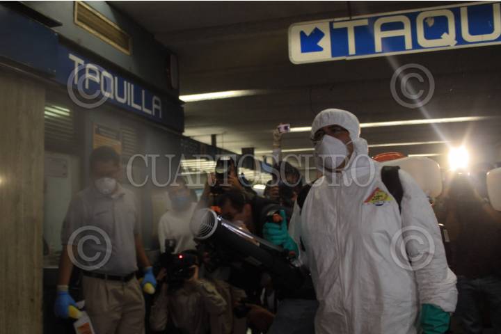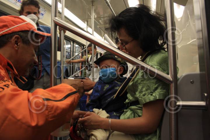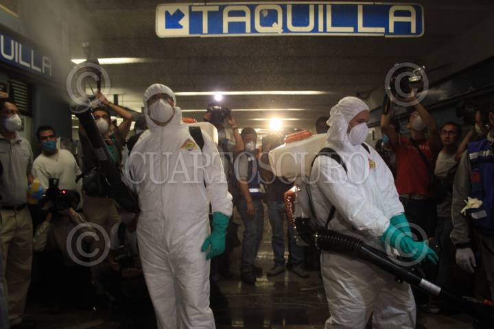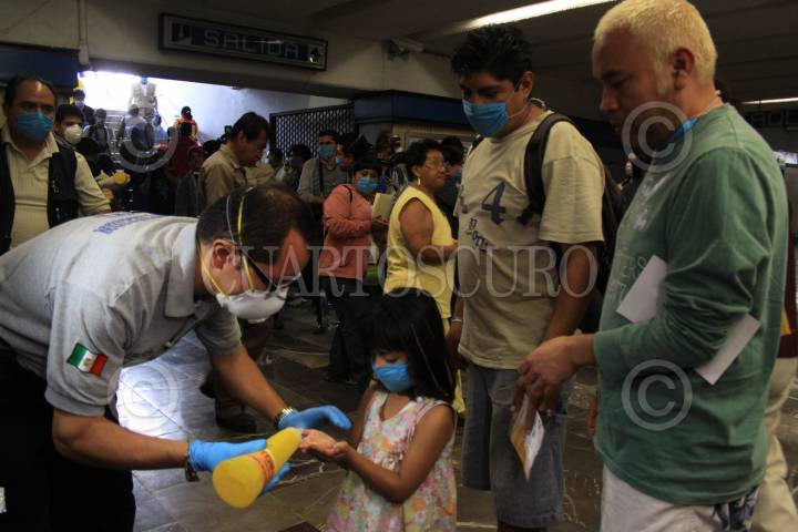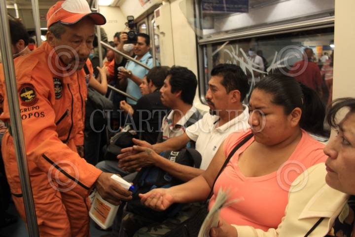 MÉXICO D.F., 02 MAYO2009.- Como parte del plan de control sanitario que operará en el Metro, con 10 acciones, la cuales incluyen la limpieza profunda en puntos de contacto como en torniquetes, pasamanos, escaleras, taquillas, locales técnicos, vagones, andenes y pasillos, de igual manera personal de protección civil reparte a los usuarios desinfectante para las manos FOTO: SÁSHENKA GUTIÉRREZ/CUARTOSCURO.COM