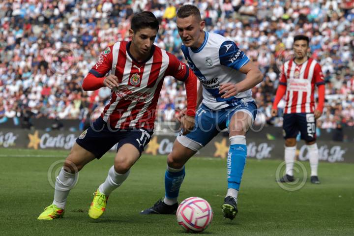 Federico Mancuello y Alan Mozo durante el partido de repechaje entre en el Club Puebla y las Chivas de Guadalajara del torneo Apertura 2022 de la Liga BBVA MX, celebrado en el estadio Cuauhtémoc.