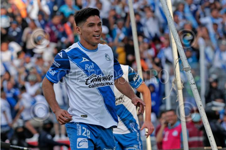 Amaury Escoto en festejo de gol durante el partido de repechaje entre en el Club Puebla y las Chivas de Guadalajara del torneo Apertura 2022 de la Liga BBVA MX, celebrado en el estadio Cuauhtémoc.