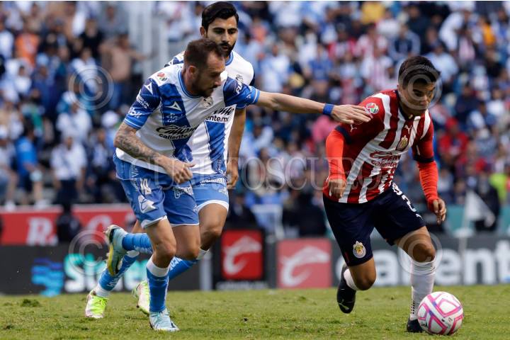 Isaac Brizuela y Lucas Jaques durante el partido de repechaje entre en el Club Puebla y las Chivas de Guadalajara del torneo Apertura 2022 de la Liga BBVA MX, celebrado en el estadio Cuauhtémoc.