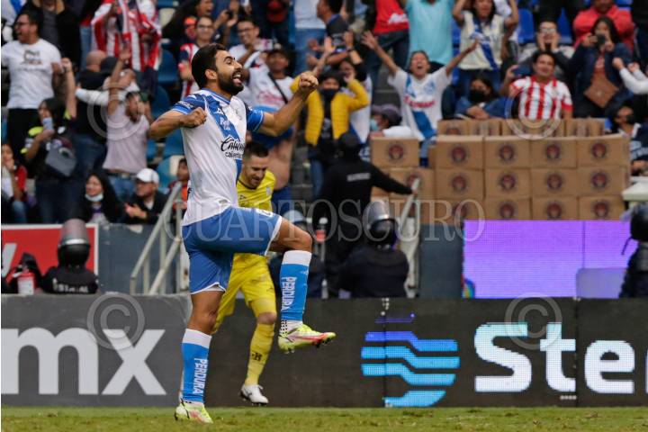Martín Barragán en festejo de gol durante el partido de repechaje entre en el Club Puebla y las Chivas de Guadalajara del torneo Apertura 2022 de la Liga BBVA MX, celebrado en el estadio Cuauhtémoc.