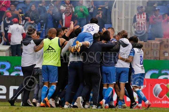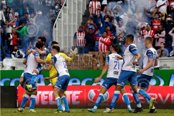 Jugadores del Puebla en festejo de gol durante el partido de repechaje ante las Chivas de Guadalajara del torneo Apertura 2022 de la Liga BBVA MX, celebrado en el estadio Cuauhtémoc.