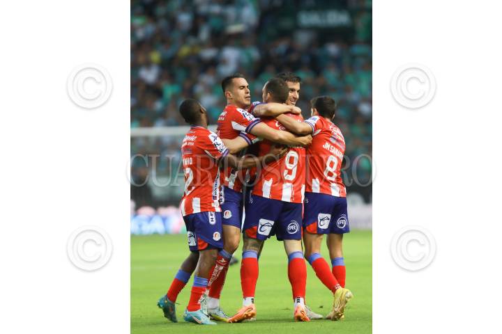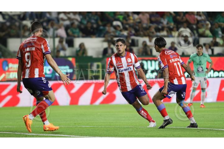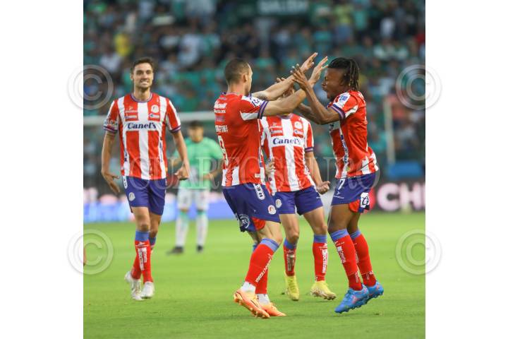 El León se enfrenta al Atlético San Luis durante el repechaje de la Liga MX. En la imagen jugadores de San Luis festejan sus anotaciones.