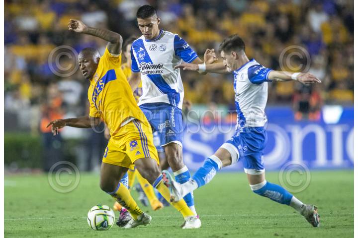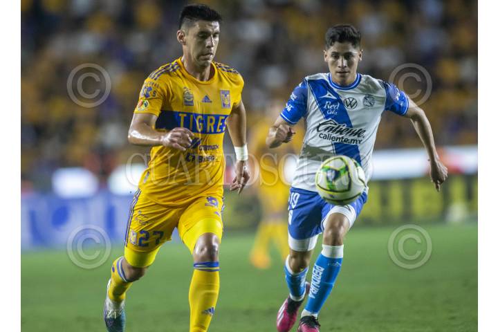 Jesús Angulo de Tigres, se disputa el balón con Ángel Robles de Puebla, en el estadio Universitario, partido correspondiente al repechaje de la Clausura 2023.
