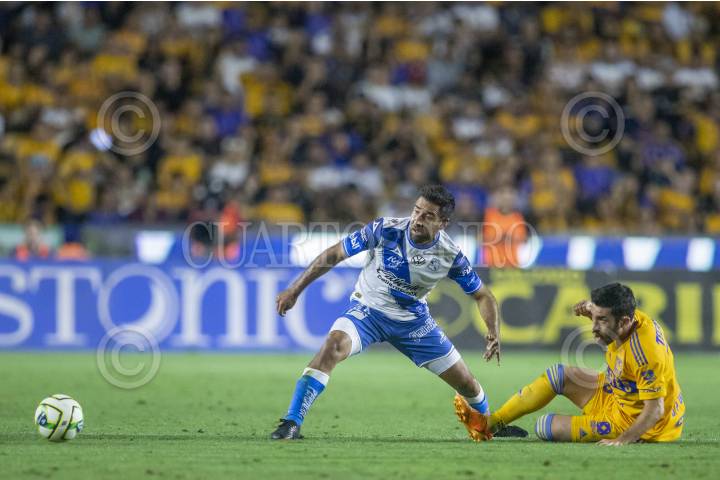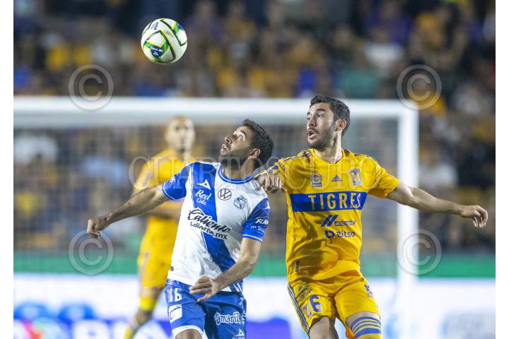 Juan Vigon de Tigres, se disputa el balón con Pablo González de Puebla, en el estadio Universitario, partido correspondiente al repechaje de la Clausura 2023.