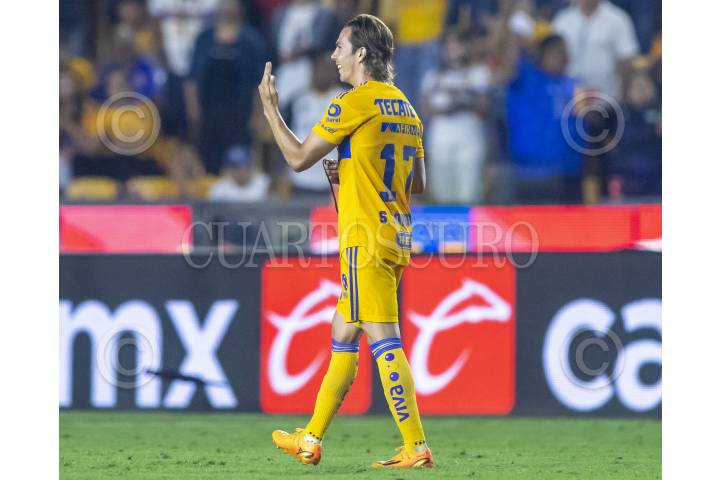 Sebastián Córdova, festeja el gol ante el Puebla, en el estadio Universitario, partido correspondiente al repechaje de la Clausura 2023.
