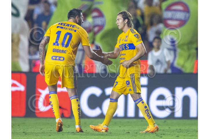 André-Pierre Gignac y Sebastián Córdova, de Tigres, festejan el gol ante el Puebla, en el estadio Universitario, partido correspondiente al repechaje de la Clausura 2023.