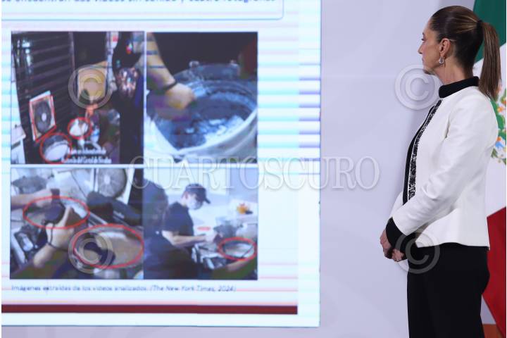CIUDAD DE MÉXICO, 02ENERO2025.- Claudia Sheinbaum, presidenta de México, observa imágenes tomadas del vídeo que publicó el periódico estadounidense, New York Times, sobre un laboratorio de fentanilo ubicado en el país. FOTO: DANIEL AUGUSTO/ CUARTOSCURO.COM