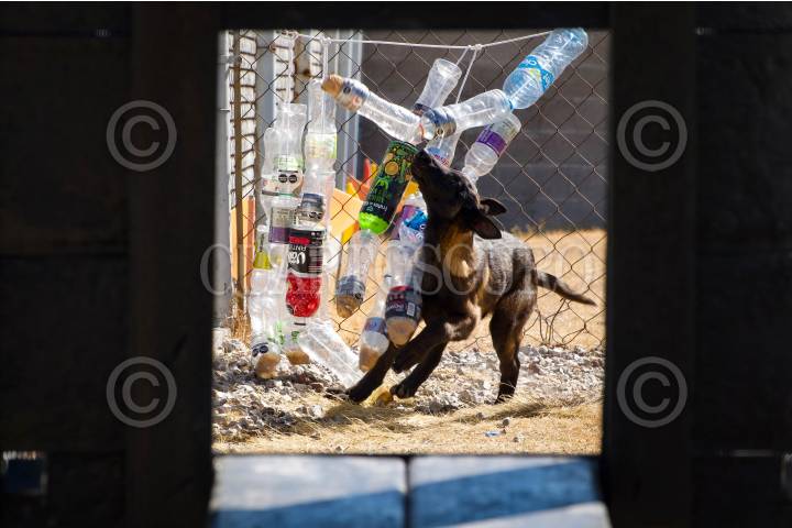 Parte de la estimulación con juego de pelota en el Centro de Producción Canina de la Sedena.