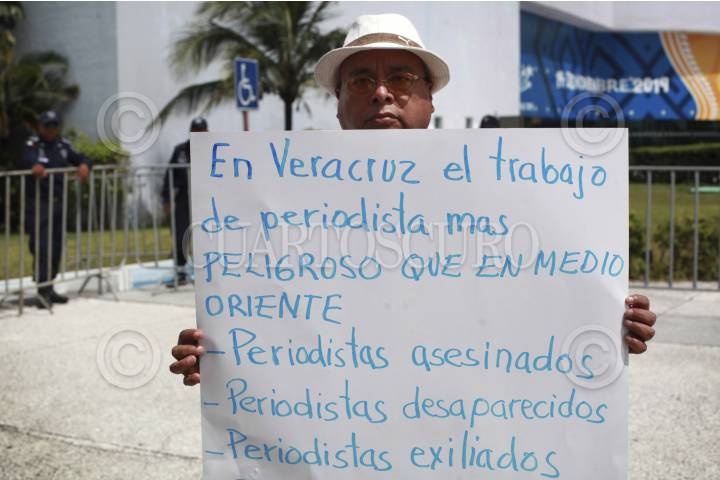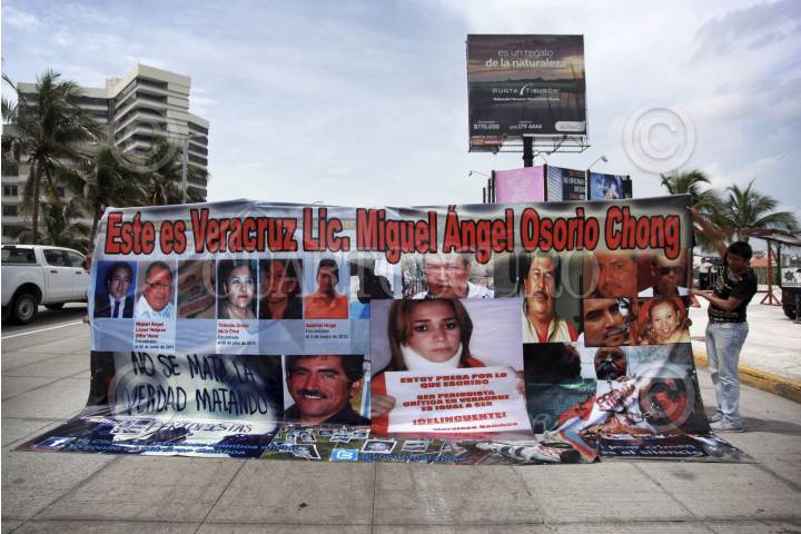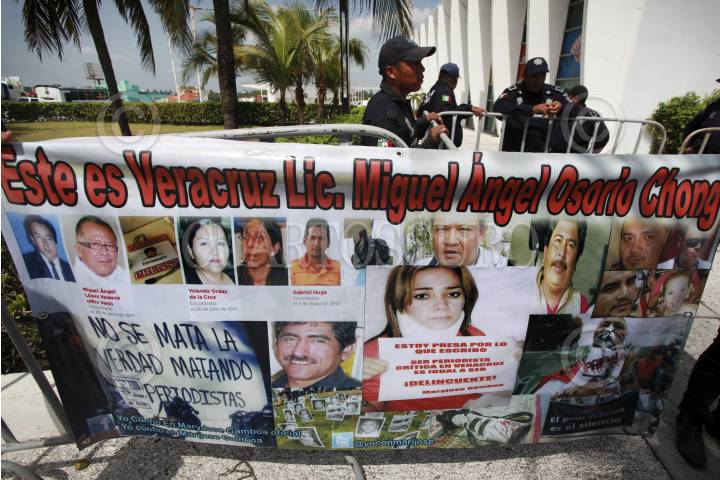 BOCA DEL RÍO, VERACRUZ, 20AGOSTO2014.- Amigos de la columnista de Notiver, María Josefina Gamboa, que se encuentra encarcelada en un penal del municipio de Tuxpan, se manifestaron a las afueras del World Trade Center durante la reunión privada que sostuvieron autoridades estatales con el Secretario de Gobernación, Miguel Ángel Osorio Chong. Los manifestantes mostraron pancartas y lonas evidenciando los casos de asesinatos, desapariciones y encarcelamiento de periodistas en el estado de Veracruz. Cabe resaltar que la mañana de este miércoles se dio a conocer la desaparición del reportero policiaco del diario Notiver, Alberto Ayala. FOTO: FÉLIX MÁRQUEZ /CUARTOSCURO.COM