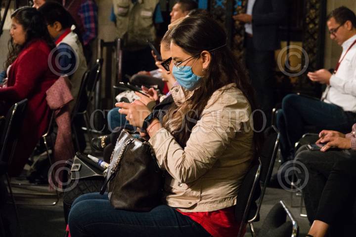 Un reportera realiza su trabajo con cubrebocas con medida preventiva ante el Covid-19