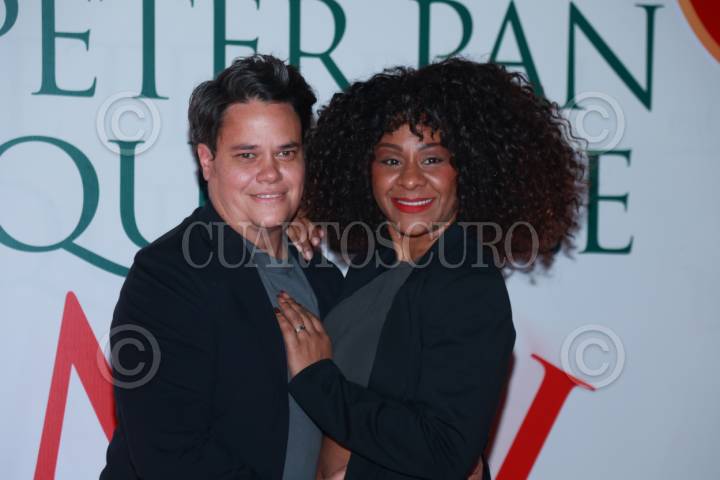 CIUDAD DE MÉXICO, 23MAYO2025. M´Balia y su pareja Alex Tinajero a su paso por la alfombra roja de la obra de teatro “Peter Pan que sale mal” celebrando sus 450 representaciones en el Foro Cultural Chapultepec. FOTO: EDGAR NEGRETE LIRA/CUARTOSCURO.COM