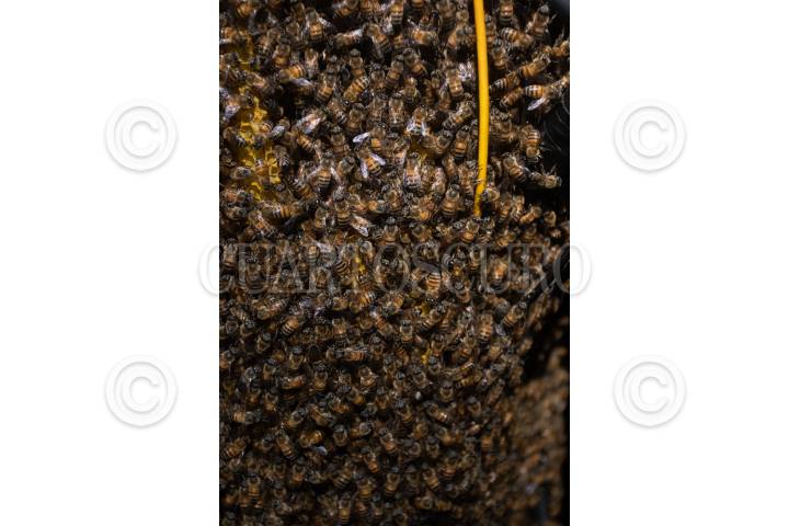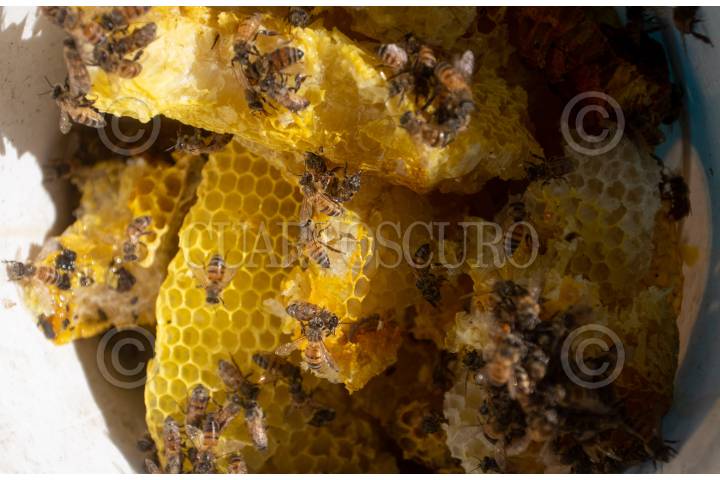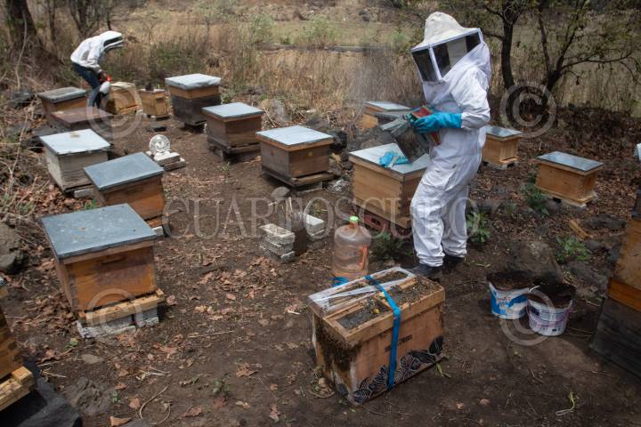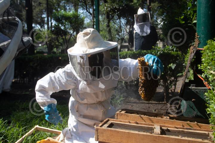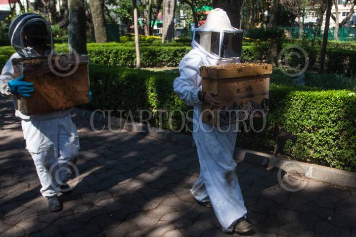 Enjambre de abejas que se encontraba en un poste en el el Parque Clemente Orozco se alimentan de simuladores de panales mientras son trasladadas hacia un Apiario para su cuidado y reproducción