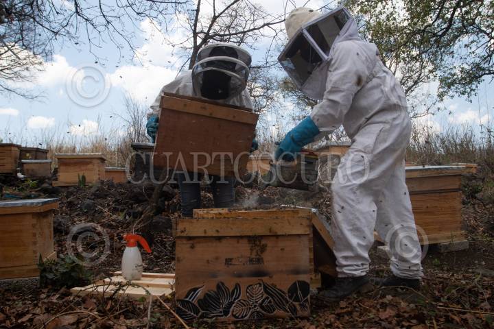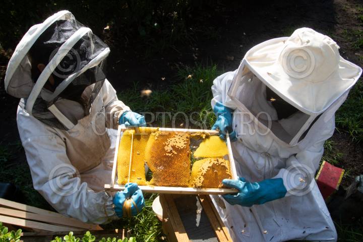 Adriana Veliz, fundadora de Abeja Negra SOS y Luz Millán, trasladaron un enjambre de abejas que se encontraba en un poste en mallas con simuladores de panales para reproducirlas en un Apiario, en el pueblo Santa Cruz Alcapixca, alcaldía Xochimilco