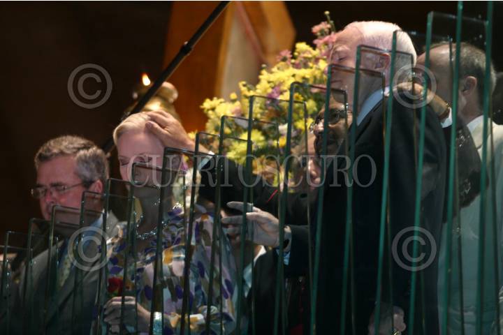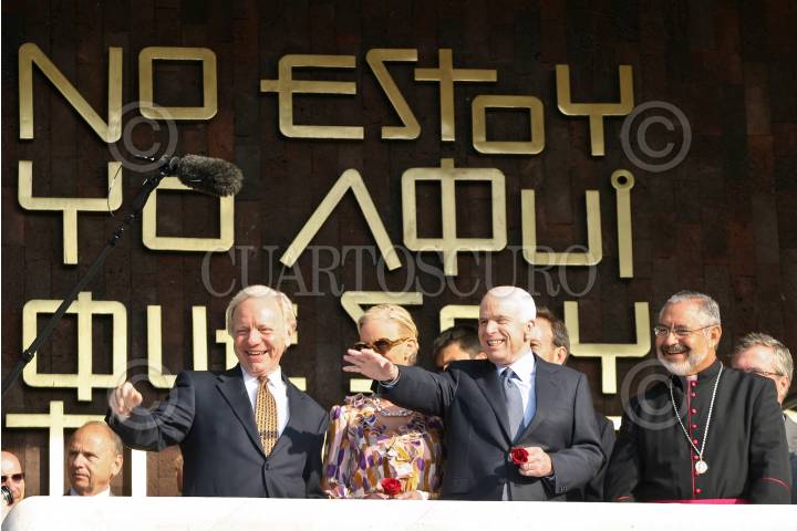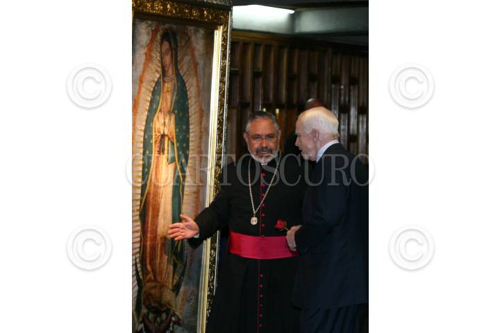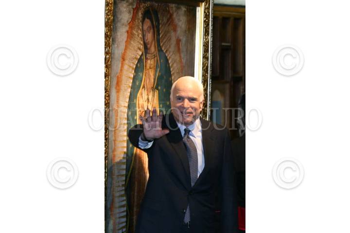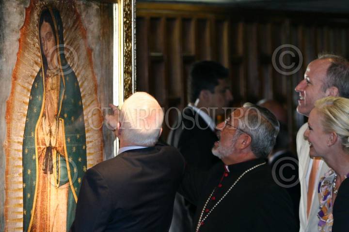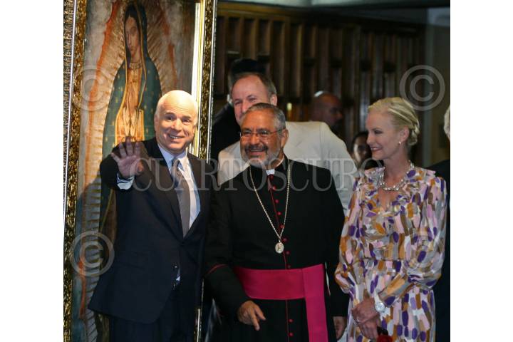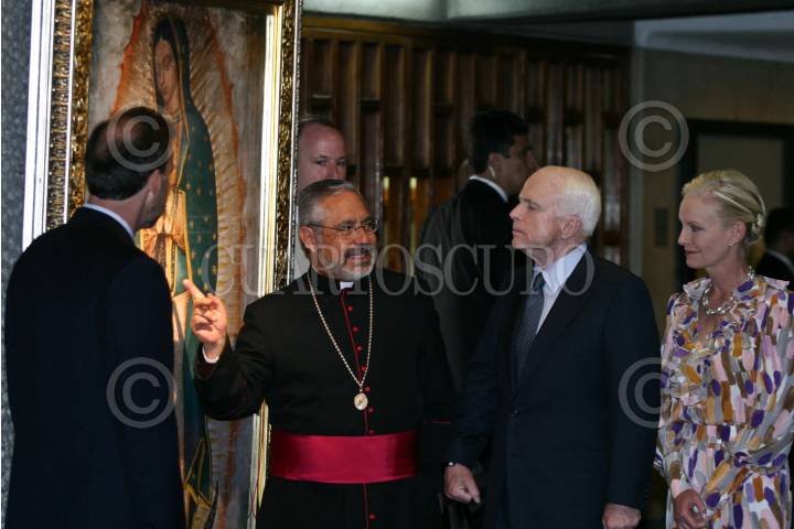 MÉXICO D.F., 03JULIO2008.- El senador por Arizona y candidato a la presidencia de Estados Unidos por el partido Repúblicano John McCain acompañado de su esposa Cindy McCain y del réctor de la Basílica Diego Monroy realizan un recorrido y observan el manto de la Virgen de Gudalupe. FOTO: RODOLFO ANGULO/CUARTOSCURO.COM