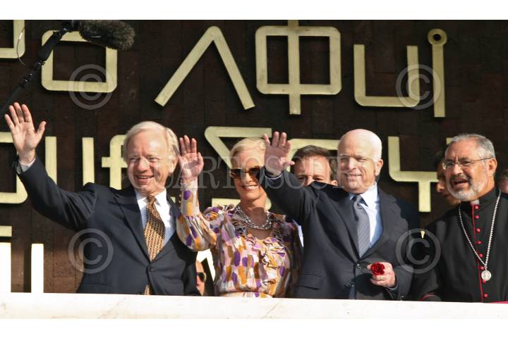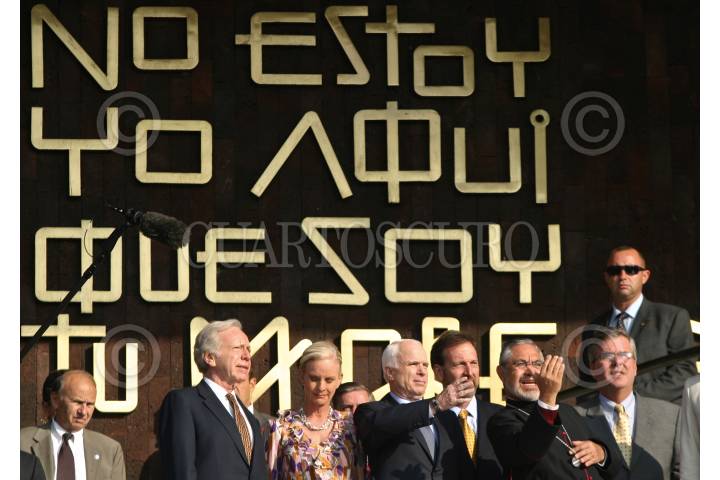 MÉXICO D.F., 03JULIO2008.- El senador por Arizona y candidato a la presidencia de Estados Unidos por el partido Repúblicano John McCain acompañado de su esposa Cindy McCain y del embajador de Estados Unidos en México Tony Garza ponen antención al réctor de la Basílica Diego Monroy durante recorrido por el balcón Papal de la Basilica de Guadalupe. FOTO: RODOLFO ANGULO/CUARTOSCURO.COM