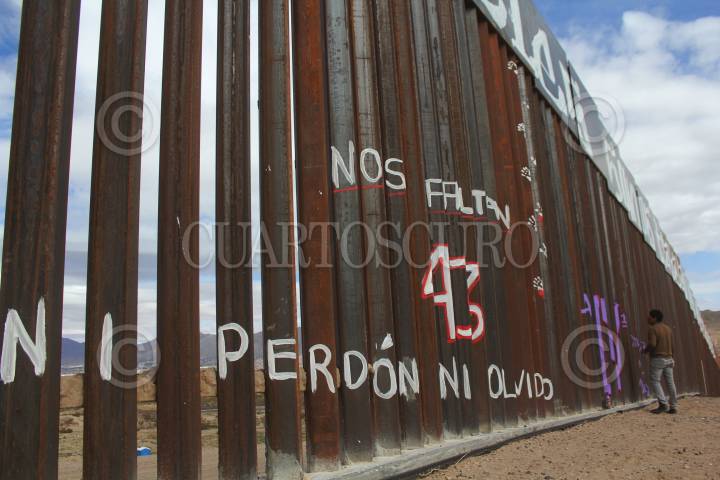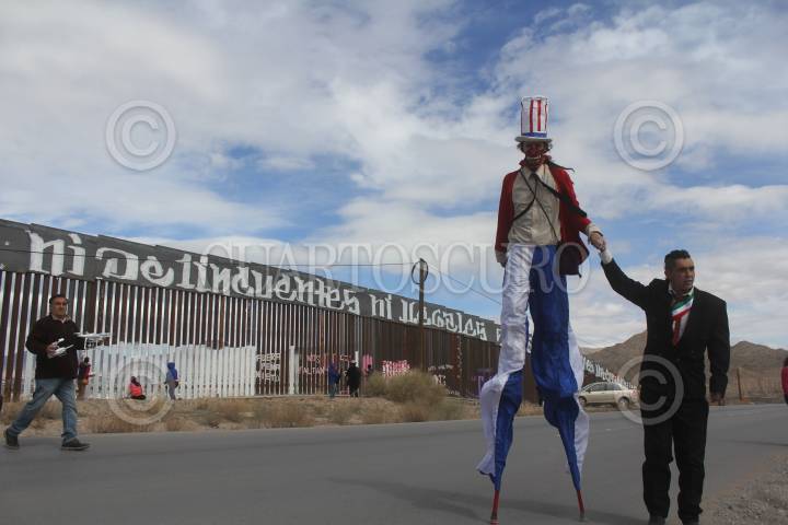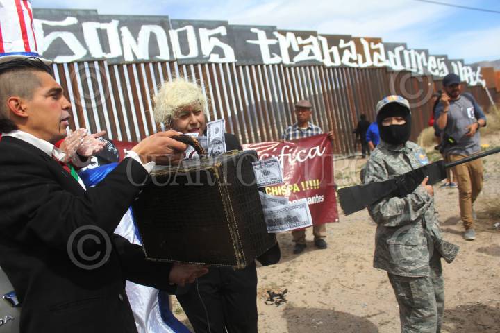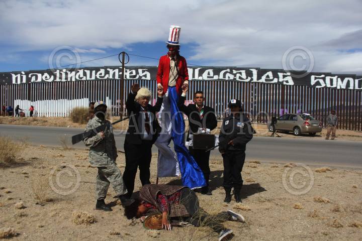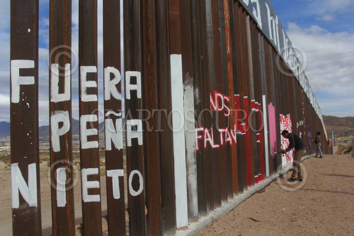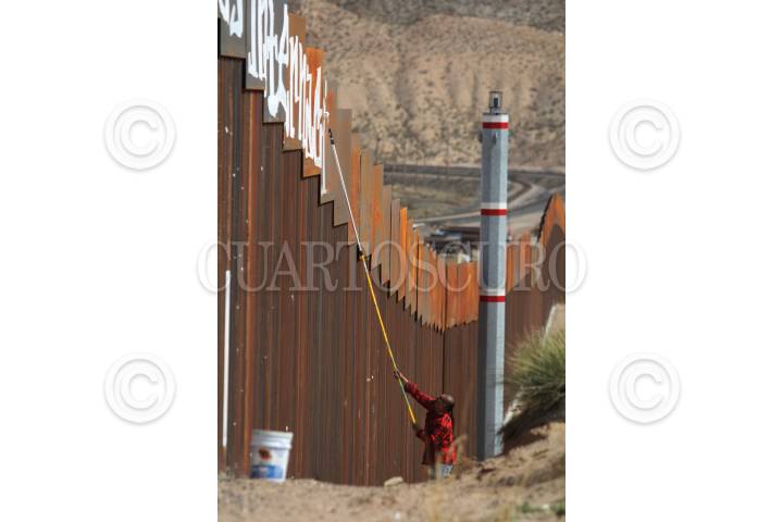 CIUDAD JUÁREZ, CHIHUAHUA, 26FEBRERO2017.- Varias organizaciones no gubernamentales hicieron una pinta en el muro fronterizo que divide a México y Estados Unidos, a la altura de la colonia Rancho Anapra, con el lema "Ni delincuentes, ni ilegales, somos trabajadores internacionales". Con esta pinta mostraron su repudio contra Donald Trump y comentaron que la mayoría de los inmigrantes que radican en la nación estadounidense son personas trabajadoras, quienes realizan trabajos del campo y sectores que muchas veces los nacidos en aquellas tierras no les interesa realizar. FOTO: NACHO RUIZ /CUARTOSCURO.COM