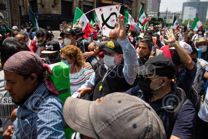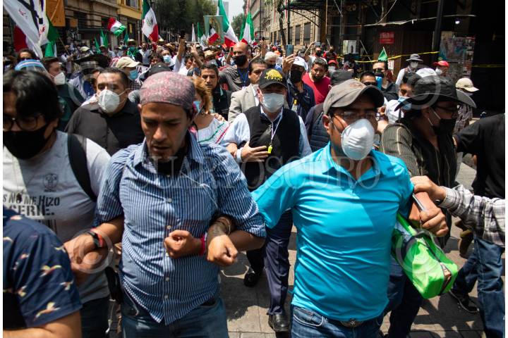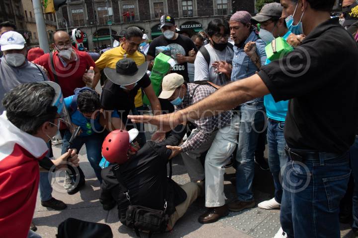 Un periodista cae durante la movilización del Frente Nacional Anti-AMLO (FRENA), la cual partió de avenida Juárez rumbo al Zócalo. FOTO: MOISÉS PABLO/CUARTOSCURO.COM