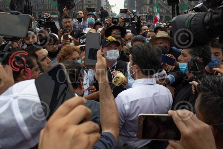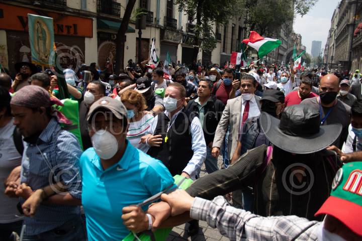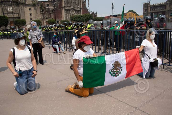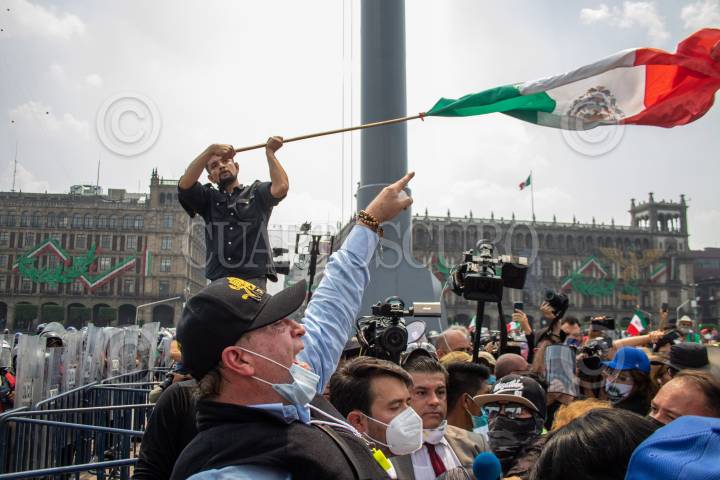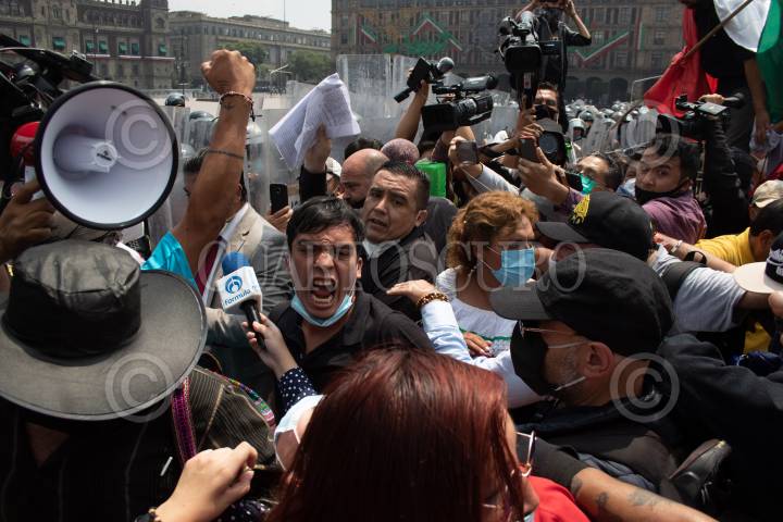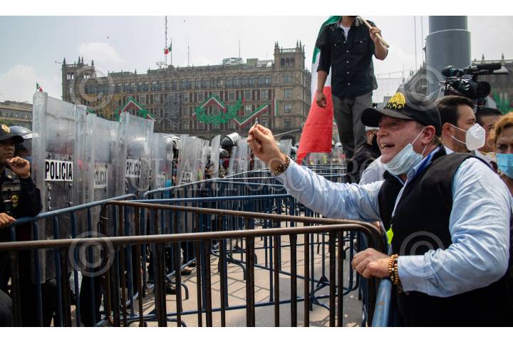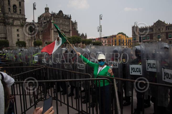 Decenas de integrantes del Frente Nacional de Anti-AMLO intentaron tomar por completo la plancha del zócalo, autoridades capitalinas solo les dejaron instalarse del asta bandera hacia el edificio del Congreso local, la otra mitad, la del asta bandera hacia el Palacio Nacional, estaba resguardada por policías capitalinos. FOTO: MOISÉS PABLO/CUARTOSCURO.COM