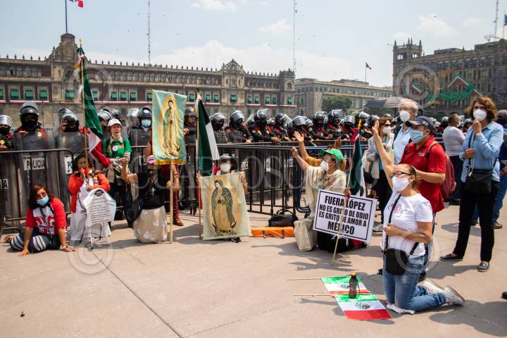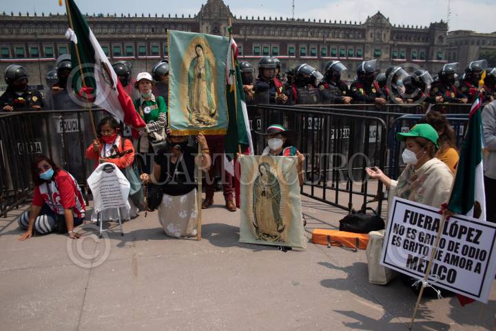 Los integrantes del Frente Nacional Anti-AMLO (FRENA) rezan en la plancha del Zócalo, luego de que marcharán de avenida Juárez hacia el primer cuadro, ahí empezaron a instalar casas de campaña. FOTO: MOISÉS PABLO/CUARTOSCURO.COM