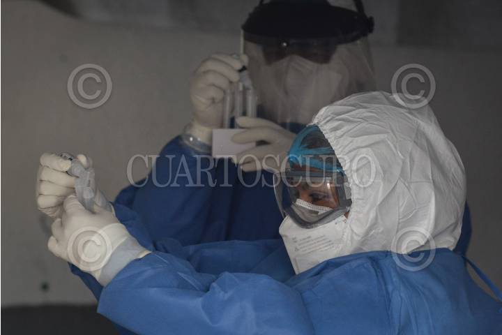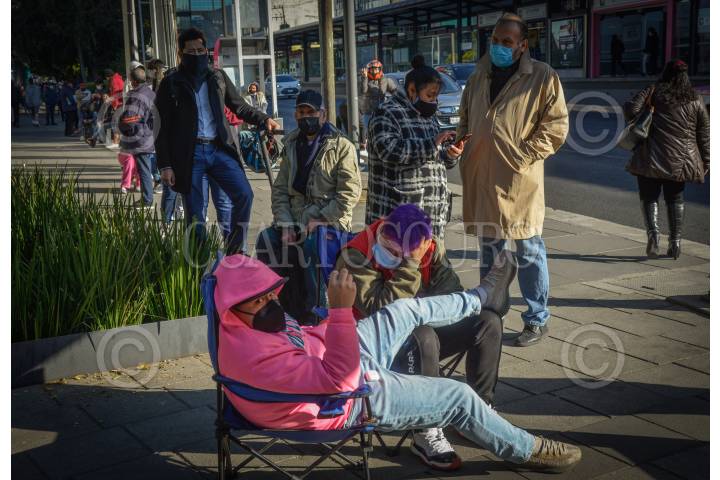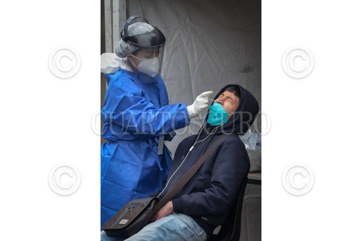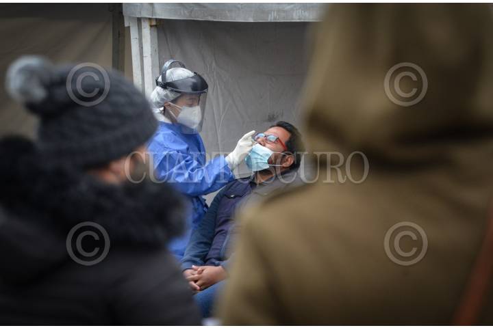 Personas asisten a realizarse la prueba rápida de detección de Covid-19 en el "macro kiosko" reinstalado al exterior de la alcaldía Venustiano Carranza. .