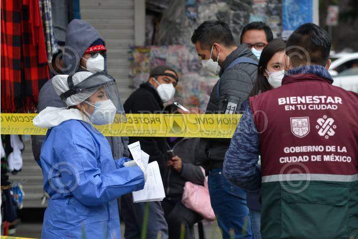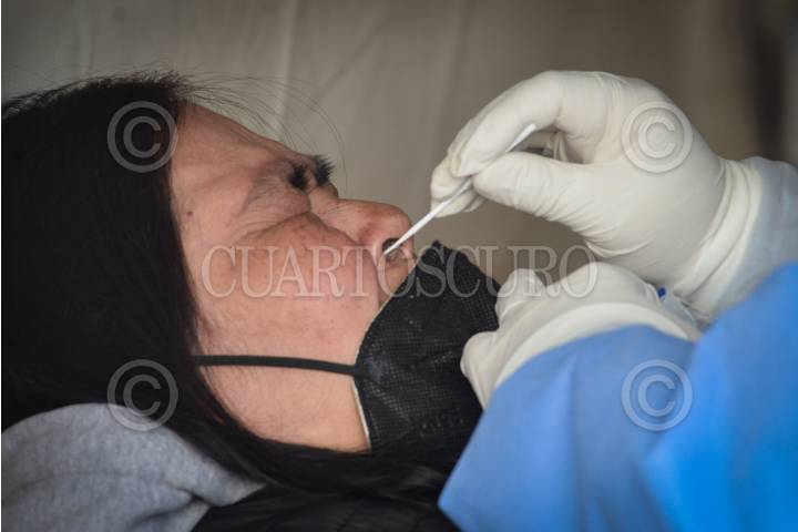 Personas asisten a realizarse la prueba rápida de detección de Covid-19 en el "macro kiosko" reinstalado al exterior de la alcaldía Venustiano Carranza.