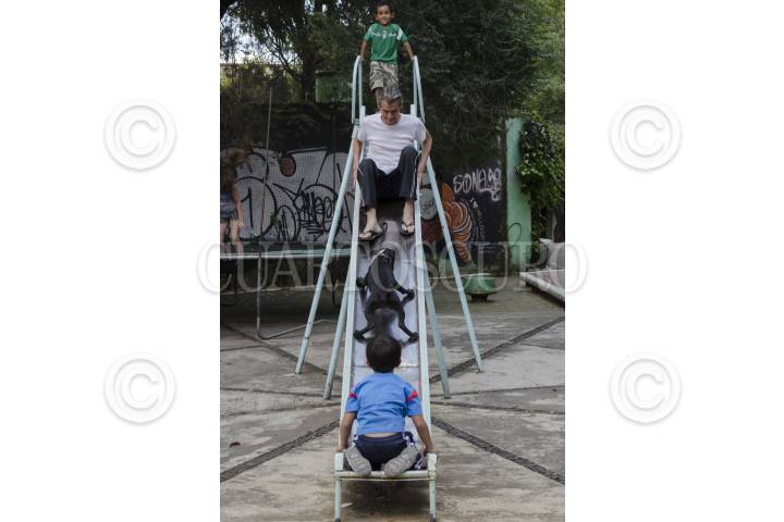 MÉXICO, D.F., 02AGOSTO2014.- De forma entretenida y expectante, un niño espera el descenso de un cachorro que asustado se aferra al desliz metálico de una resbaladilla. FOTO: MARÍA JOSÉ MARTÍNEZ /CUARTOSCURO.COM