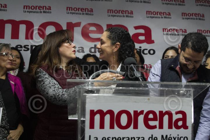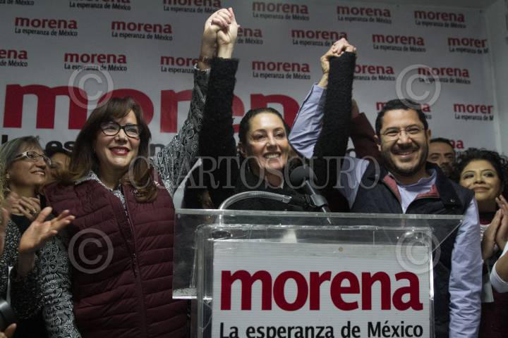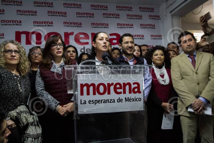 CIUDAD DE MÉXICO, 10DICIEMBRE2017.- Claudia Sheinbaum se registró como precandidata a la gubernatura de la Ciudad de México en la sede local del partido Morena, la ex delegada de Tlalpan se perfila como candidata única de esta organización políitca. En la imagen la acompañan Yeidckol Polevnsky, secretaria general de Morena, y Martí Batres, dirigente local de Morena. FOTO: MOISÉS PABLO /CUARTOSCURO.COM