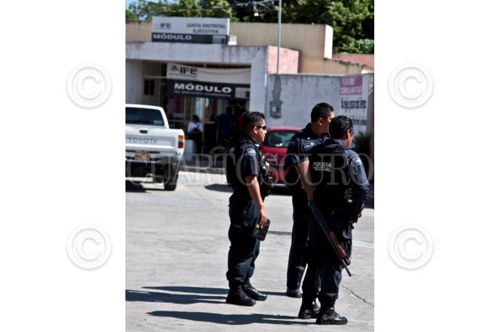 COMALCALCO, TABASCO, 08JULIO2009.- Elementos de la Policía Federal Preventiva resguardan los alrededores del Distrito Electoral Dos del IFE ubicado en la colonia Las Rosas, donde se lleva a cabo el conteo de votos que se obtuvo de los ciudadanos para diputado federal. FOTO: MARCO POLO GUZMÁN HERNÁNDEZ/CUARTOSCURO.COM