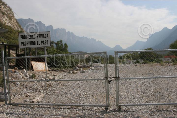 SANTA CATARINA, NUEVOLEON.05DIC.2006.- La entrada a la zona tiene una pueerta cerrada con cadenas y en donde no se puede pasar a predio. Decenas de Regiomontanos han protestadado ante la eventual destrucción de una de las zonas naturales más hermosas de Nuevo León, y donde se encuentra además el manto friático que provee de agua a la zona metropolitana de Monterrey, se encuentra en riesgo ante proyecto Valle de Reyes para el que se urbanizarían más de 2 mil 394 héctareas del cañon de Ballesteros, en la Huasteca, con una inversión de más 500 millones de dolares y en el que se planea construir 5 residencias por cada héctarea . FOTO PEDRO VALTIERRA/CUARTOSCURO.COM