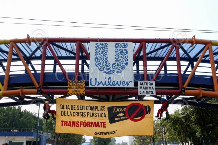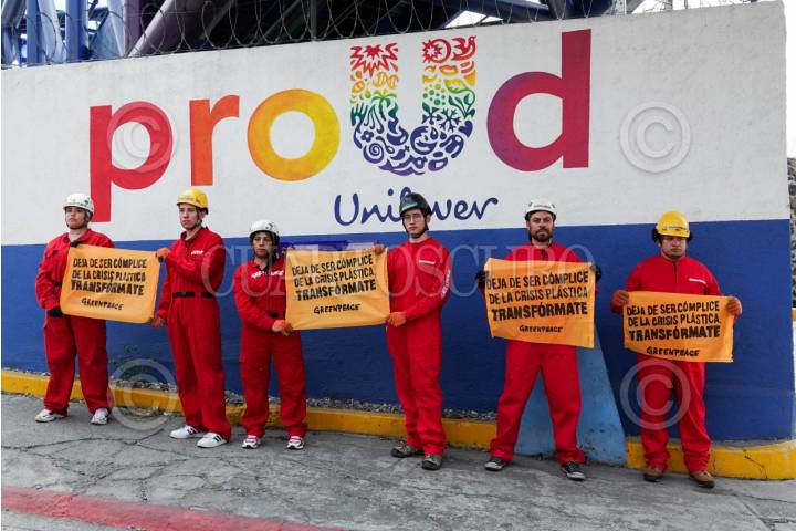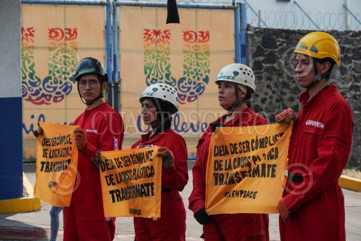 JIUTEPEC, MORELOS, 14MAYO2024.- Activistas de la organización Greenpeace México se manifestaron en las inmediaciones de la empresa Unilever. Reclaman que este grupo es el tercero a nivel mundial en la producción de plásticos en productos de consumo diario, lo cuales están afectando a comunidades y el medio ambiente, sobre todo el fondo marino. Exigen a Unilever acciones concretas y eficaces para atender y regular este tipo de contaminantes. FOTO: GALO CAÑAS/CUARTOSCURO.COM