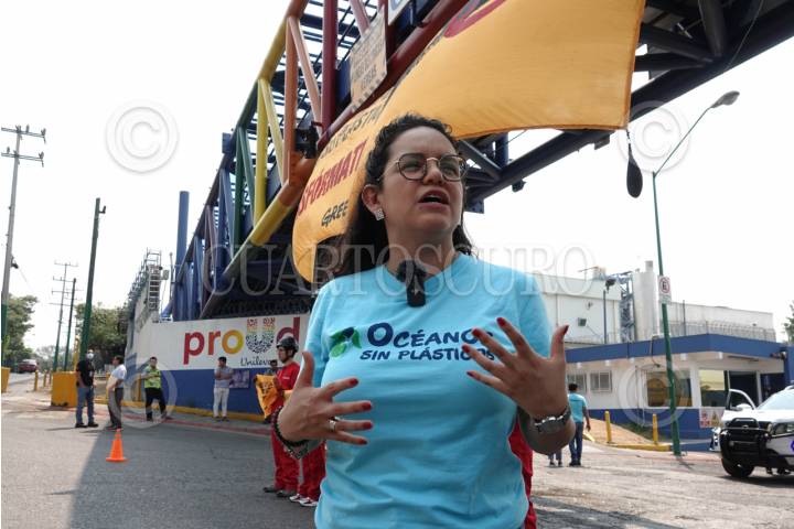JIUTEPEC, MORELOS, 14MAYO2024.- Ornela Garelli, campañista de la organización Greenpeace México. se posiciona durante la protesta en las inmediaciones de la empresa Unilever. Reclaman que este grupo es el tercero a nivel mundial en la producción de plásticos en productos de consumo diario, lo cuales están afectando a comunidades y el medio ambiente, sobre todo el fondo marino. Exigen a Unilever acciones concretas y eficaces para atender y regular este tipo de contaminantes. FOTO: GALO CAÑAS/CUARTOSCURO.COM