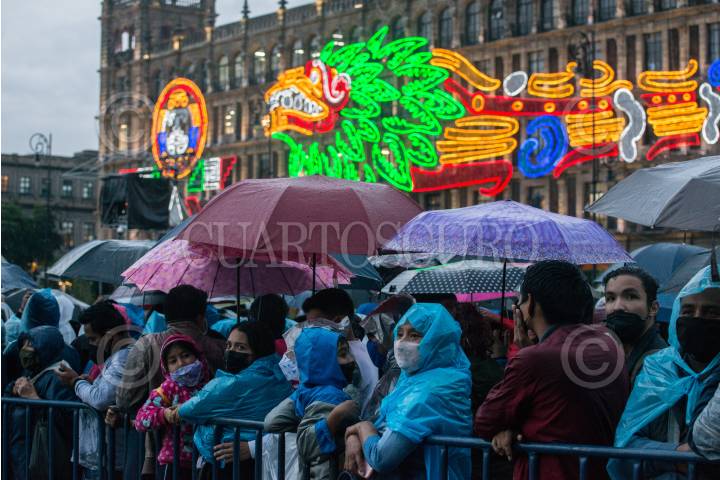 Decenas de personas se dieron cita en el Zócalo capitalino, durante el semáforo naranja, para presenciar la inauguración del espectáculo "Memoria Luminosa".