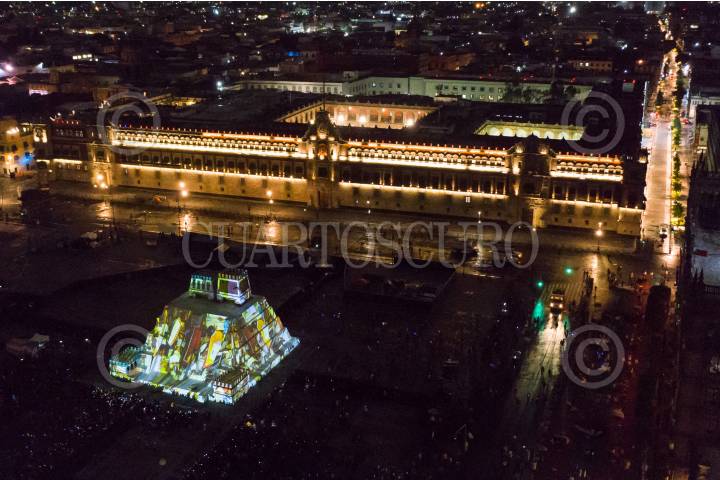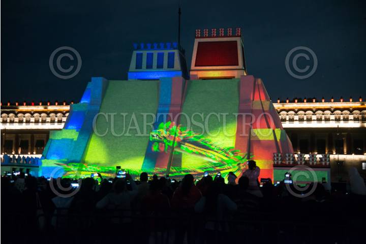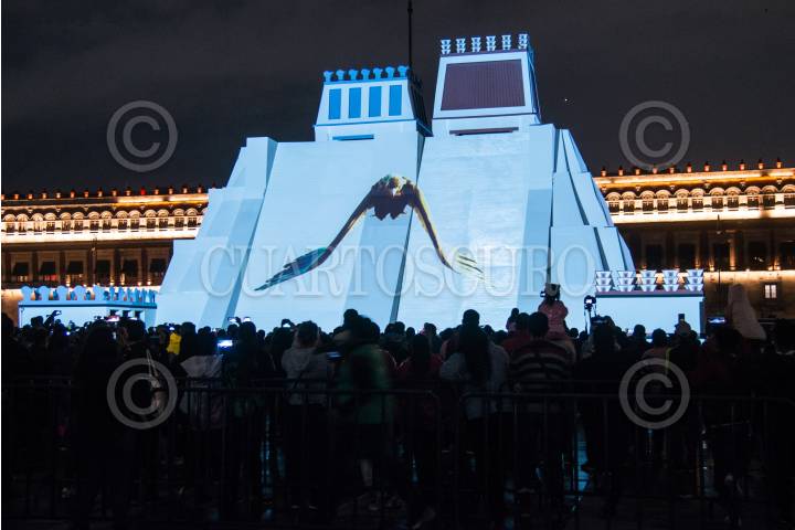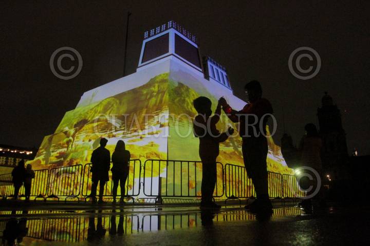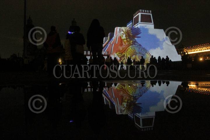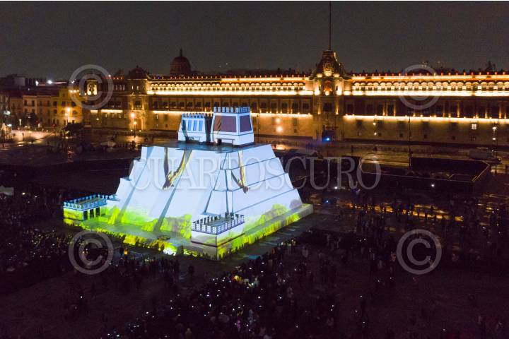 Dio inicio la proyección de “Memoria Luminosa” en la maqueta monumental del Huey-Teocalli en el Zócalo capitalino, con motivo de los 500 Años de Resistencia Indígena