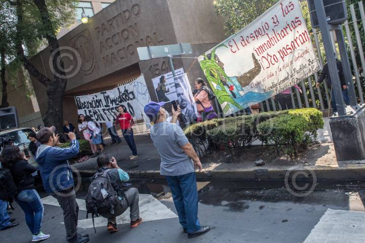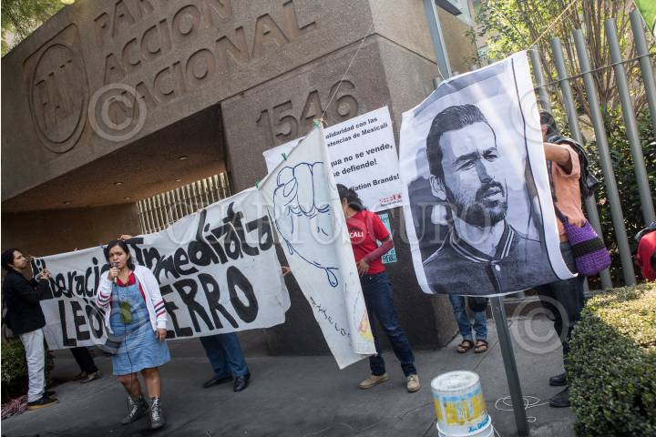 CIUDAD DE MÉXICO, 14MAYO2018.- Miembros de diversas organizaciones sociales se manifestaron en la Sede Nacional del Partido Acción Nacional para exigir la libertad del ingeniero León Fierro, activista miembro del colectivo Mexicali Resiste, quienes desde hace aproximadamente dos años han mantenido una serie de acciones para echar fuera de Baja California a la cervecera Constellation Brands, debido a que la empresa pretende consumir un alto porcentaje de agua que causaria un desabasto a los agricultores y ciudadanos. León Fierro fue detenido hace unas semanas por el gobierno panista Francisco Vega de Lamadrid FOTO: TERCERO DÍAZ /CUARTOSCURO.COM