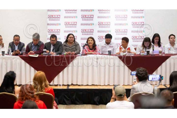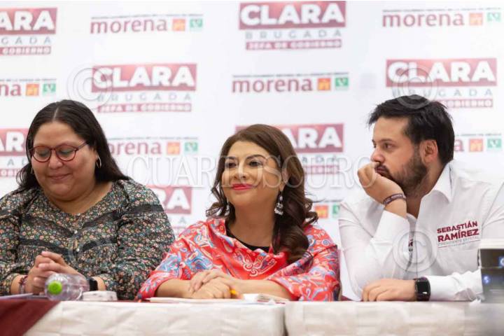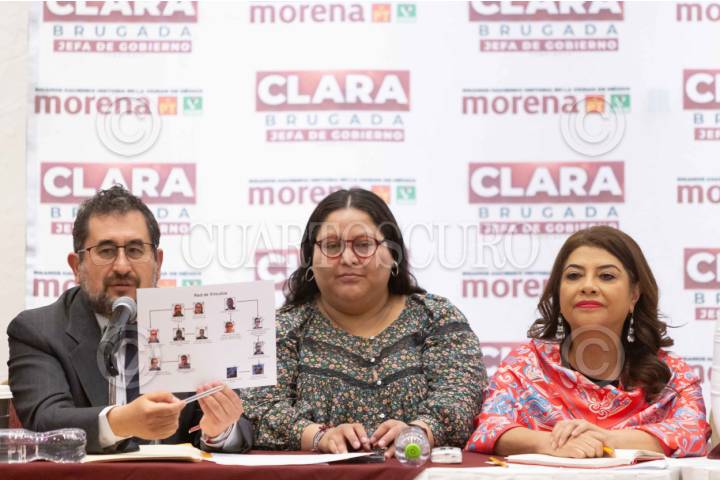 CIUDAD DE MÉXICO, 25ABRIL2024.- Clara Brugada, candidata a la jefatura de Gobierno por la coalición "Sigamos haciendo historia" (Morena, PT, y PVEM), ofreció conferencia para describir como “excesivas” las medidas cautelares que concedió la Comisión Permanente de Quejas del Instituto Electoral de la Ciudad de México (IECM) de no difundir ninguna calumnia o acusación en contra Santiago Taboada, candidato a la jefatura de gobierno por la coalición "Va por la CDMX". Estuvo acompañada por: Citlalli Hernández, secretaria general de Morena, y Sebastián Ramírez, presidente de Morena en la Ciudad de México. FOTO: PRENSA CLARA BRUGADA/CUARTOSCURO.COM
