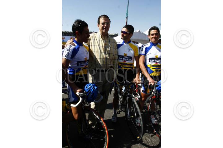MÉXICO, D.F. 11NOVIEMBRE2007.- El jefe de gobierno capitalino, Marcelo Ebrard Casaubón durante la premiación de la Carrera Ciclista. En la imagen Los ganadores del primer, segundo, y tercer lugar, respectivamente Domingo GonzÁlez, Mario Contreras y Oscar Barrón. FOTO: PAOLA HIDALGO/CUARTOSCURO.COM