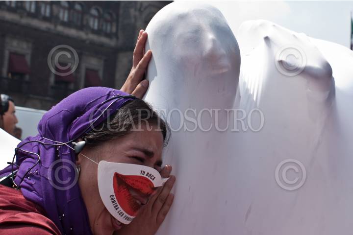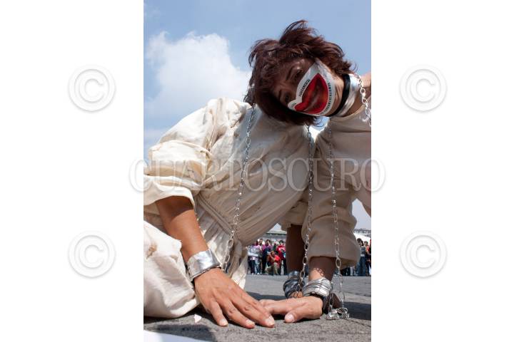 MÉXICO, D.F., 17JUNIO2009.- Diferentes organizaciones sociales se manifestaron con un performance en la plancha del Zócalo en contra de políticos que promovieron la legislación que prohíbe la interrupción del embarazo, con cadenas en las manos loas protestantes pidieron a las autoridades respetar el derecho y sexualidad de las mujeres. FOTO: RICARDO CASTELAN/CUARTOSCURO.COM