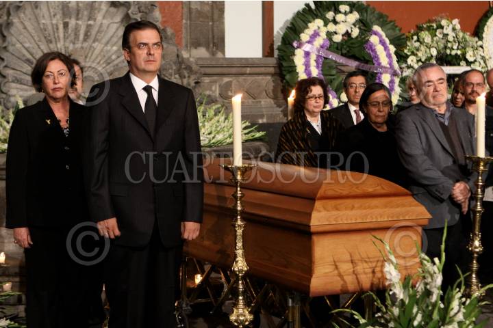 MÉXICO, D.F., 19JUNIO2010.- Marcelo Ebrard, jefe de gobierno del Distrito Federal, montó una guardia de honor ante el féretro donde descansa el cuerpo del escritor mexicano Carlos Monsiváis en un homenaje de cuerpo presente que se realiza en el Museo de la Ciudad de México; Carlos Monsiváis falleció esta tarde a la edad de 72 años a las 13:48 horas de esta tarde en el área de terapia intensiva del Instituto Nacional de Ciencias Médicas y Nutrición, por insuficiencia respiratoria como consecuencia de fibrosis pulmonar. FOTO: RODOLFO ANGULO/CUARTOSCURO.COM