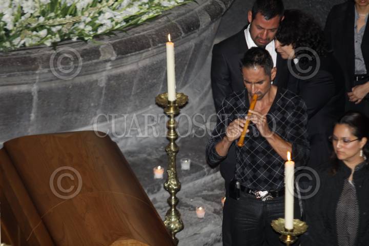 MÉXICO, D.F., 19JUNIO2010.- El flautista Horacio Franco montó una guardia de honor ante el féretro donde descansa el cuerpo del escritor mexicano Carlos Monsiváis en un homenaje de cuerpo presente que se realiza en el Museo de la Ciudad de México; Carlos Monsiváis falleció esta tarde a la edad de 72 años a las 13:48 horas de esta tarde en el área de terapia intensiva del Instituto Nacional de Ciencias Médicas y Nutrición, por insuficiencia respiratoria como consecuencia de fibrosis pulmonar. FOTO: RODOLFO ANGULO/CUARTOSCURO.COM