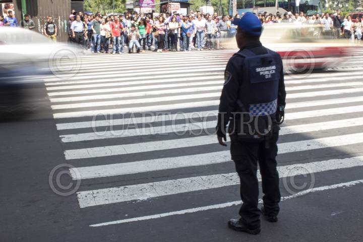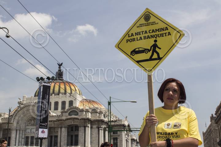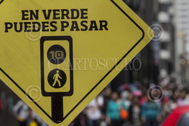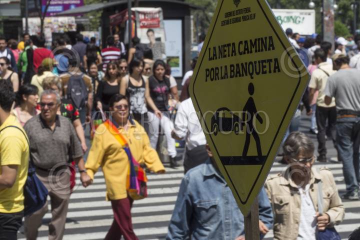 MEXICO, D.F., 16AGOSTO2014.- En el marco del día del peatón, el gobierno capitalino implementó una campaña para promover la cultura de la responsabilidad peatonal, invitando a los peatones a transitar adecuadamente por las calles de la ciudad, empleando banquetas y espacios destinados para tal fin. Dicha campaña se llevó a cabo en la esquina de la avenida Madero y Eje Central, en el Centro Histórico de la ciudad. FOTO: DAVID POLO /CUARTOSCURO.COM